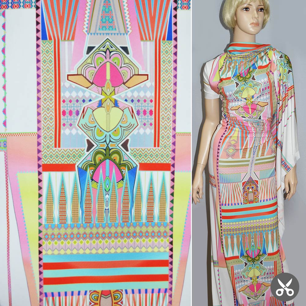Трикотаж вискозный стрейч белый с двухсторонним рисунком полоски с орнаментом ш.150 купить в розницу и оптом