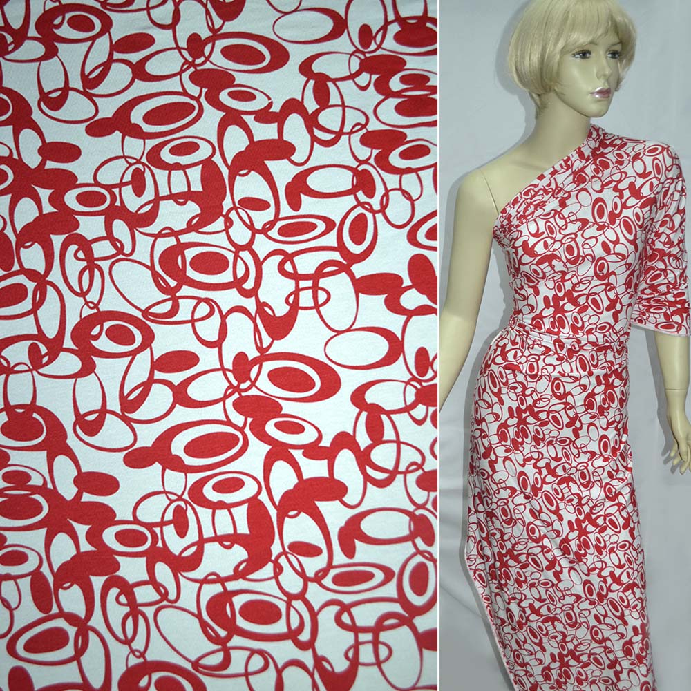 Трикотаж вискозный стрейч белый с красными овалами ш.130 купить в розницу и оптом