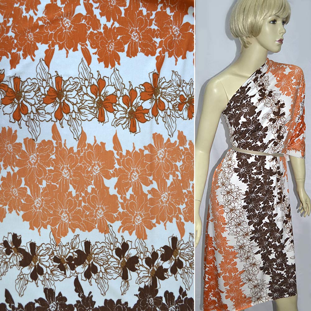 Трикотаж вискозный стрейч белый в оранжевые цветы. Состав ткани: Вискоза-98, Эластан-2. Плотность ткани: 236 г/м.кв. Страна производитель: Германия. Трикотаж - это мягкая плотная материя, не прозрачная. Приятная на ощупь, комфортная в носке. Благодаря содержанию синтетических материй, материал более износостойкий и надолго сохраняет свой первоначальный вид. Ткань отличается своей приятной текстурой, хорошей растяжимостью, практически не мнется. Трикотаж достаточно простой в уходе. Используется для пошива платьев, спортивных костюмов, легких жакетов, поло, футболок и многого другого.