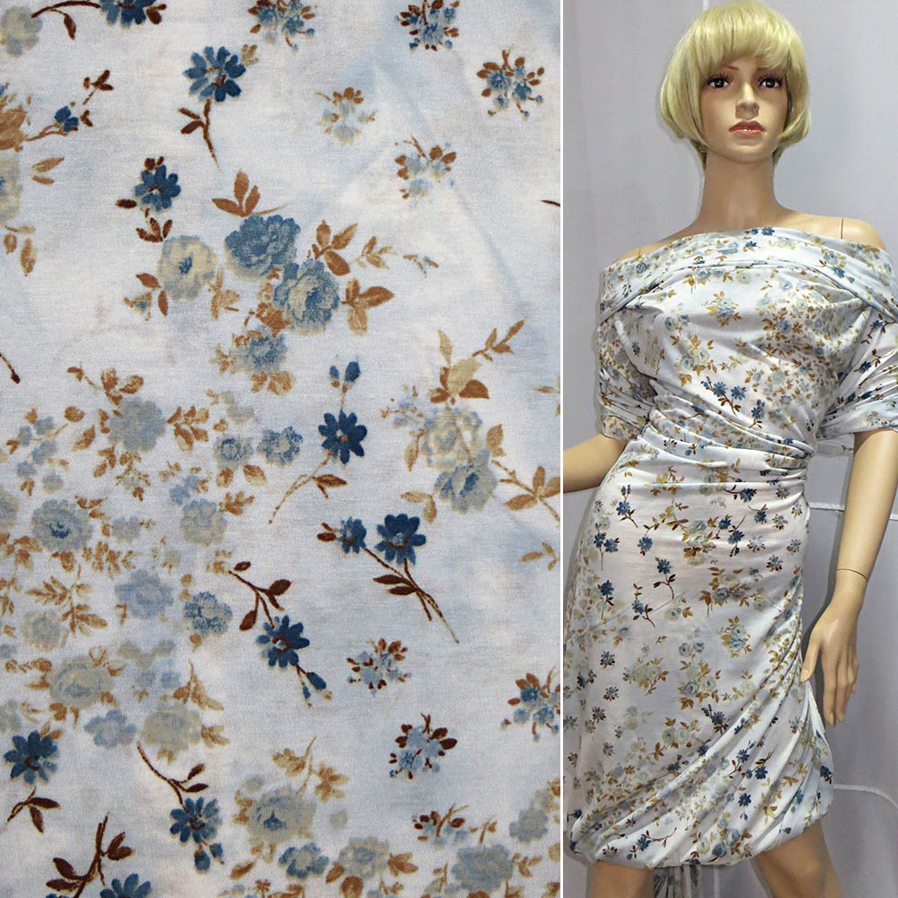 Трикотаж вискозный стрейч бледно-голубой с бледно-голубой веточкой и синие цветы ш.140 купить в розницу и оптом