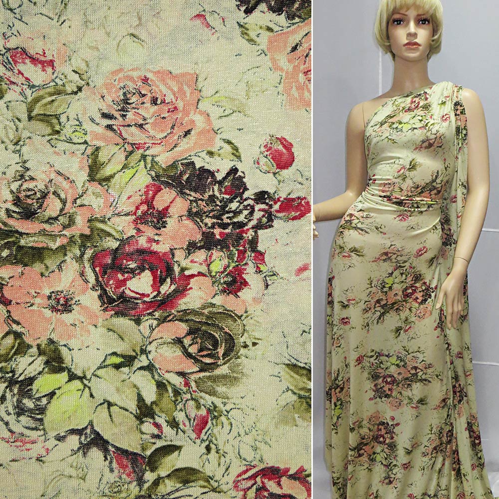 Трикотаж вискозный стрейч бледно-оливковый с розовыми цветами ш.140 купить в розницу и оптом