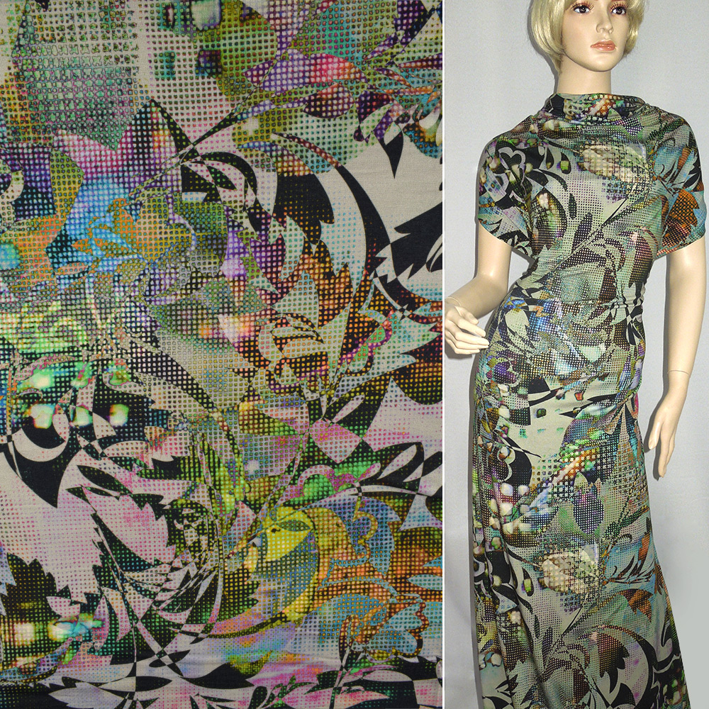 Трикотаж вискозный стрейч болотный светлый с разноцветным калейдоскопом ш.150 купить в розницу и оптом