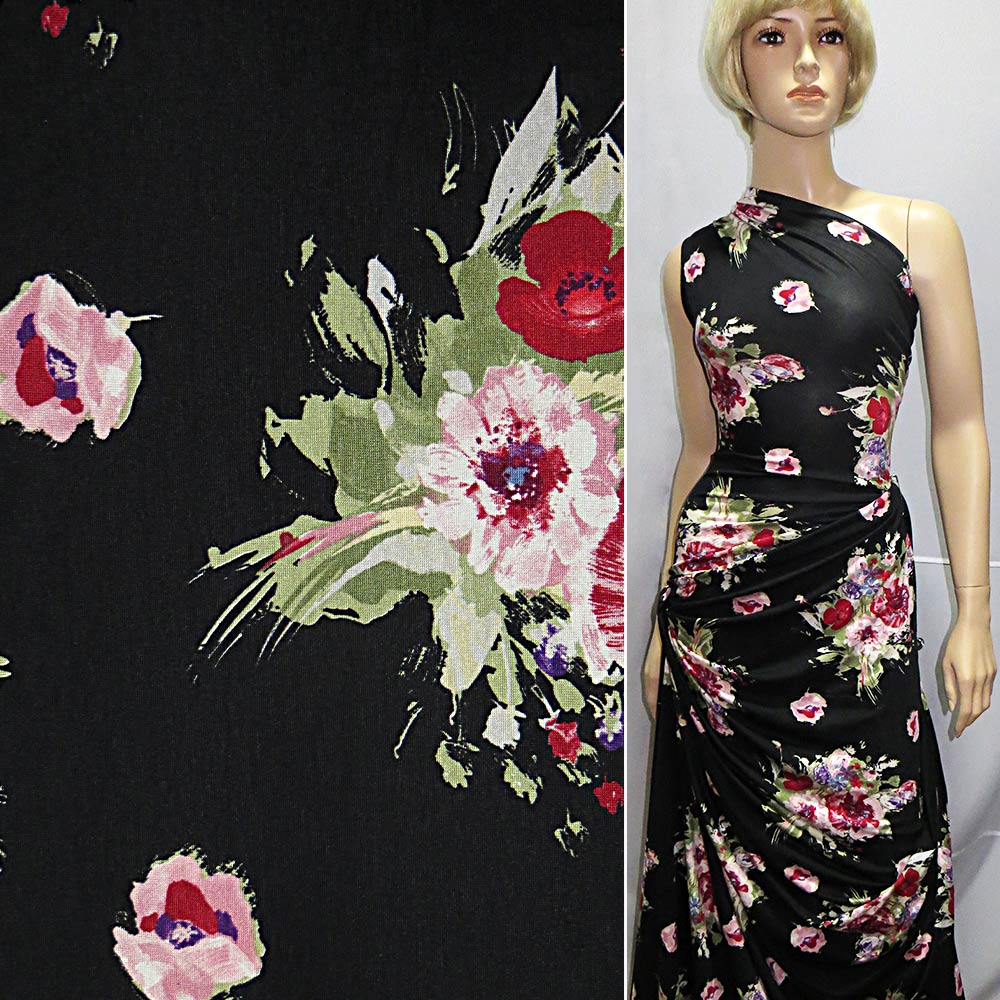 Трикотаж вискозный стрейч черный в красные розы ш.145 купить в розницу и оптом