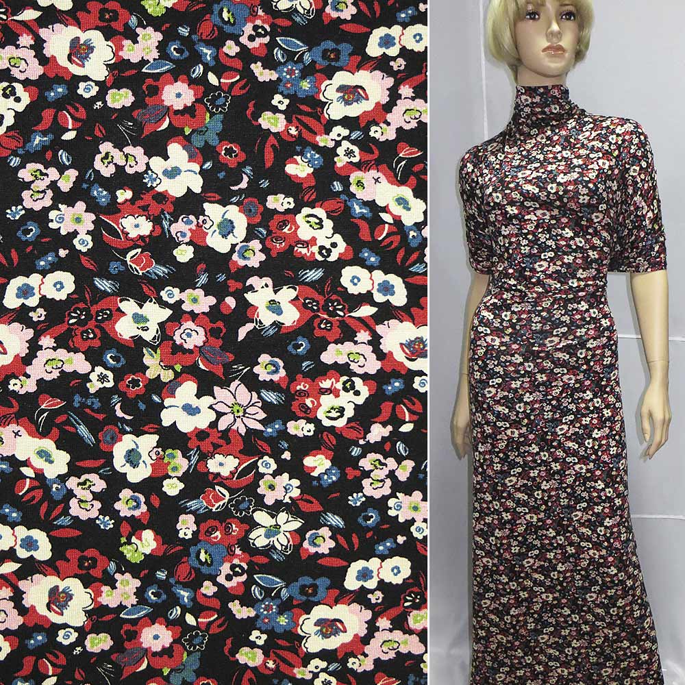 Трикотаж вискозный стрейч черный в молочно-красные цветочки ш.152. Состав ткани: Вискоза-96, Эластан-4. Плотность ткани: 198 г/м.кв. Страна производитель: Германия. Трикотаж - это мягкая плотная материя, не прозрачная. Приятная на ощупь, комфортная в носке. Благодаря содержанию синтетических материй, материал более износостойкий и надолго сохраняет свой первоначальный вид. Ткань отличается своей приятной текстурой, хорошей растяжимостью, практически не мнется. Трикотаж достаточно простой в уходе. Используется для пошива платьев, спортивных костюмов, легких жакетов, поло, футболок и многого другого.