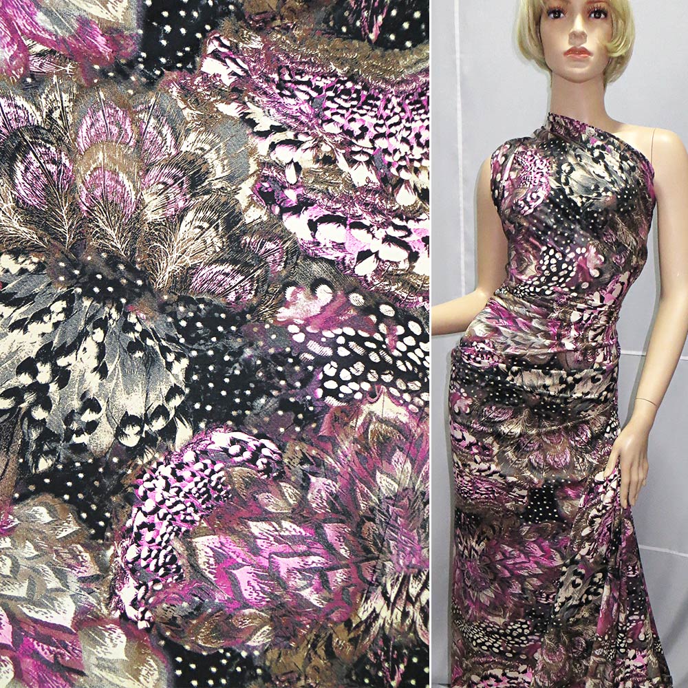 Трикотаж вискозный стрейч коричнево-черный с розовым, перья ш.150 купить в розницу и оптом