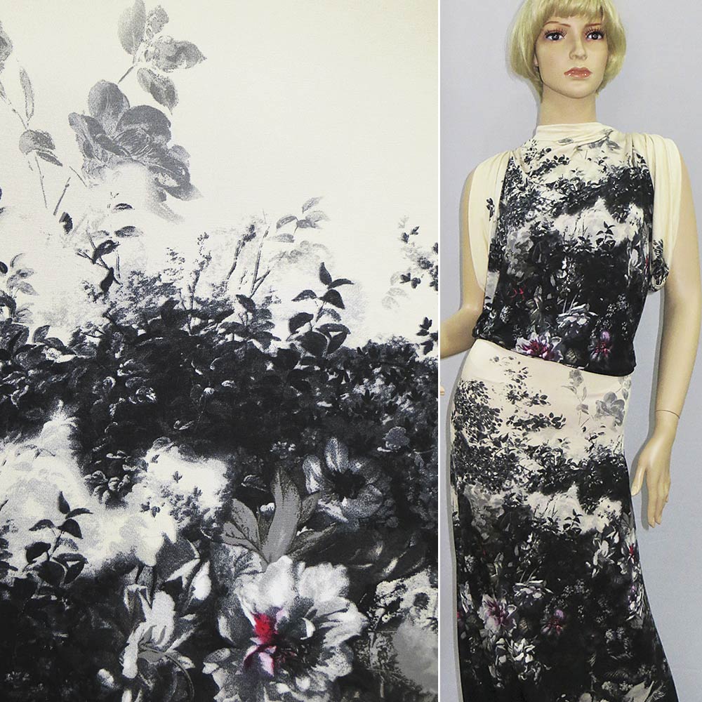 Трикотаж вискозный стрейч кремово-черный раппорт с цветами ш.155 купить в розницу и оптом