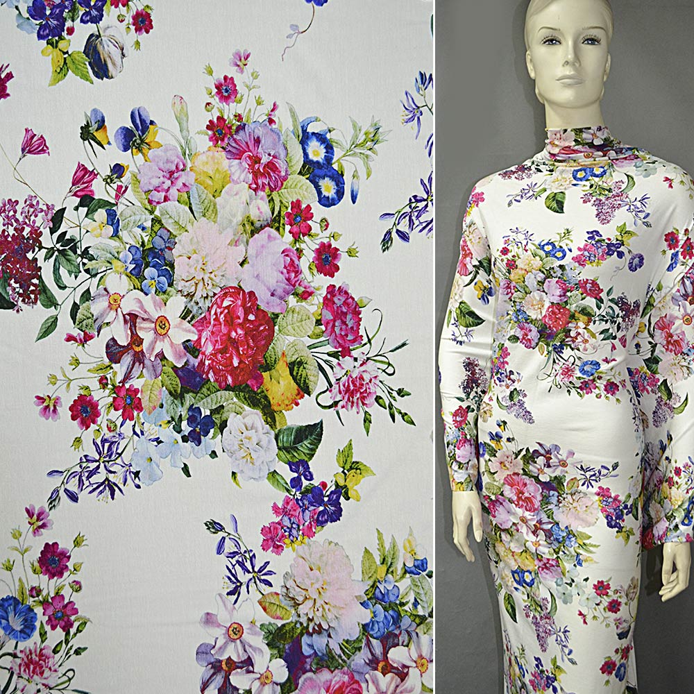 Трикотаж вискозный стрейч кремовый с букетом разноцветных цветов ш.150 купить в розницу и оптом