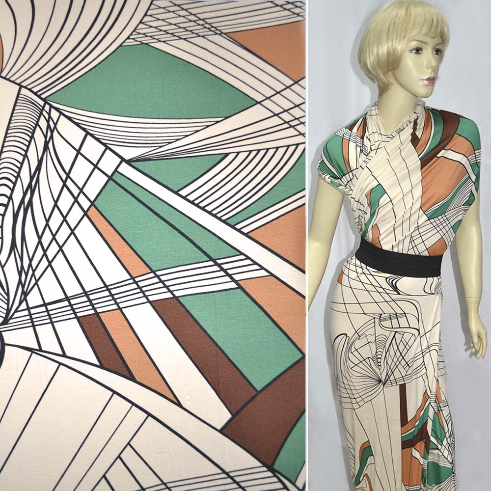 Трикотаж вискозный стрейч кремовый с коричнево-зелеными полосками и черным контуром ш.140 купить в розницу и оптом