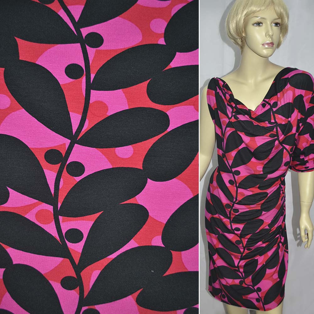 Трикотаж вискозный стрейч малиново-красный с черными листьями ш.150 купить в розницу и оптом