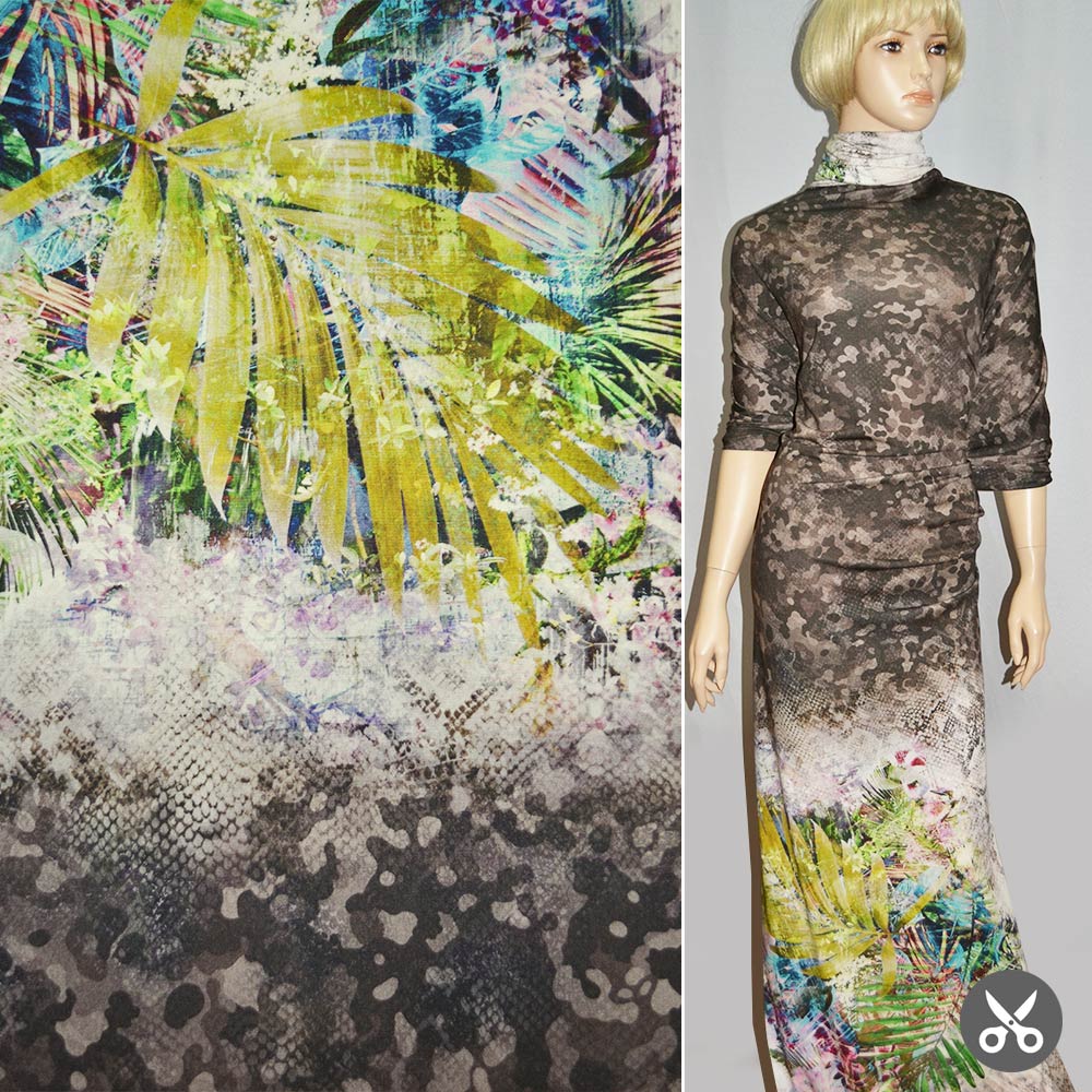 Трикотаж вискозный стрейч молочно-коричневый рептилии с цветным рисунком раппорт ш.152. Состав ткани: Вискоза-96, Эластан-4. Плотность ткани: 152 г/м.кв. Страна производитель: Германия. Трикотаж - это мягкая плотная материя, не прозрачная. Приятная на ощупь, комфортная в носке. Благодаря содержанию синтетических материй, материал более износостойкий и надолго сохраняет свой первоначальный вид. Ткань отличается своей приятной текстурой, хорошей растяжимостью, практически не мнется. Трикотаж достаточно простой в уходе. Используется для пошива платьев, спортивных костюмов, легких жакетов, поло, футболок и многого другого.