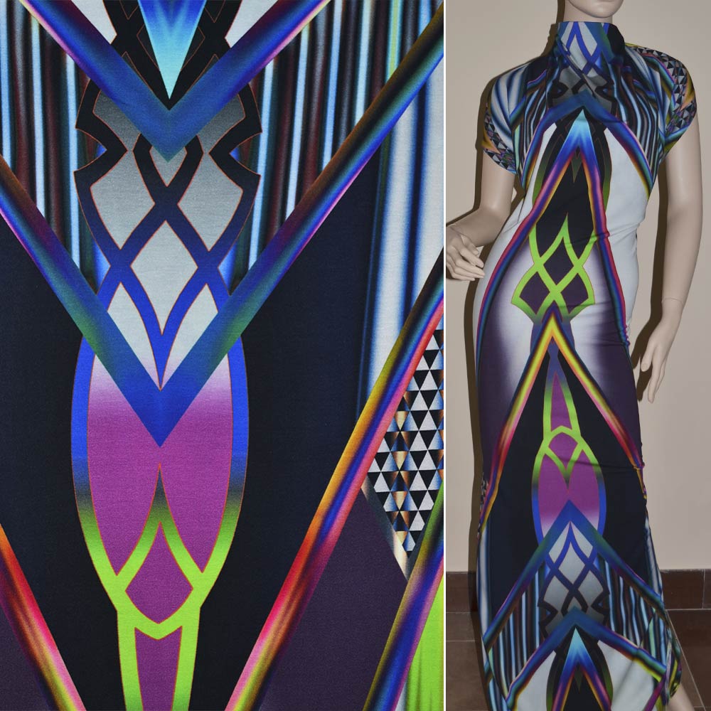Трикотаж вискозный стрейч молочно-серый с крупной разноцветной абстракцией ш.150. Состав ткани: Вискоза-96, Эластан-4. Плотность ткани: 199 г/м.кв. Страна производитель: Германия. Трикотаж - это мягкая плотная материя, не прозрачная. Приятная на ощупь, комфортная в носке. Благодаря содержанию синтетических материй, материал более износостойкий и надолго сохраняет свой первоначальный вид. Ткань отличается своей приятной текстурой, хорошей растяжимостью, практически не мнется. Трикотаж достаточно простой в уходе. Используется для пошива платьев, спортивных костюмов, легких жакетов, поло, футболок и многого другого.