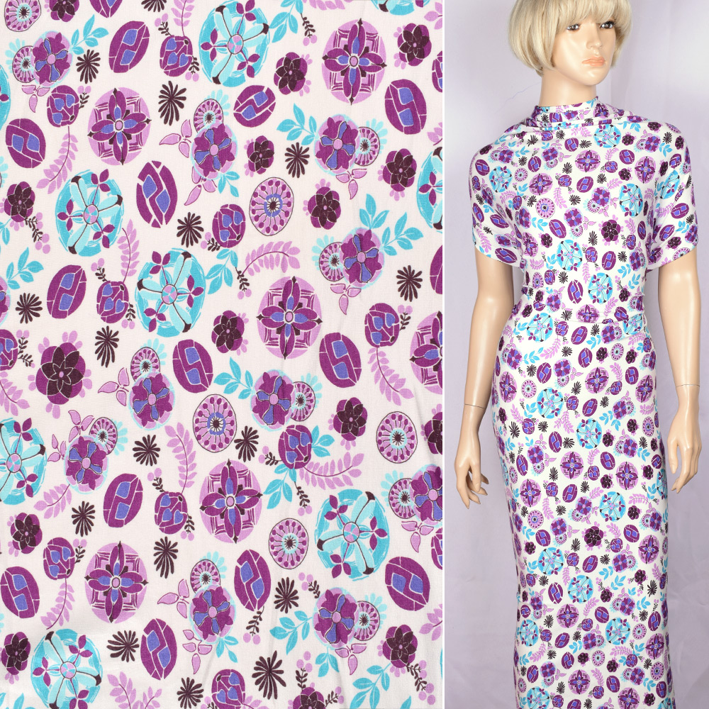 Трикотаж вискозный стрейч молочный с голубыми бордово-черными кругами и цветами ш.148 купить в розницу и оптом