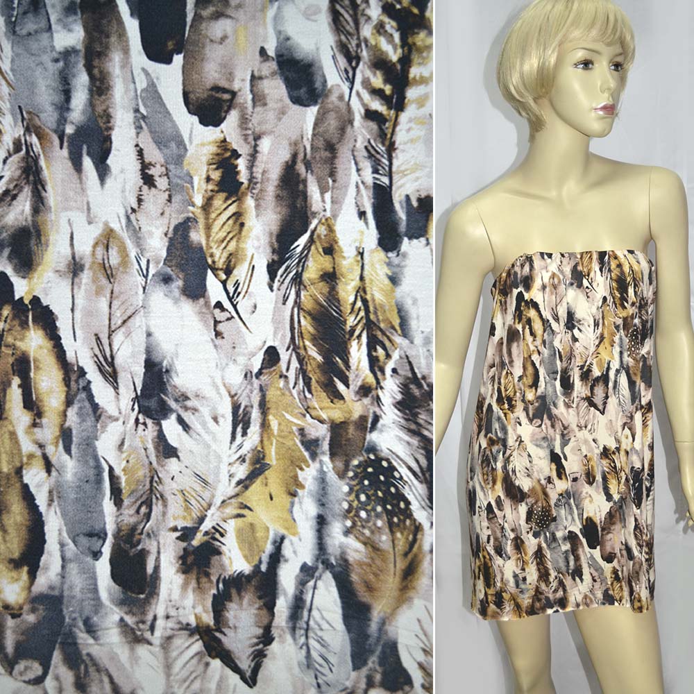 Трикотаж вискозный стрейч молочный с густыми коричнево-желтыми перьями ш.150 купить в розницу и оптом