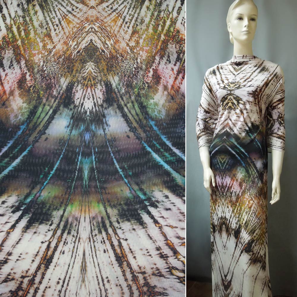 Трикотаж вискозный стрейч молочный с серо-рыжей абстракцией ш.140 купить в розницу и оптом