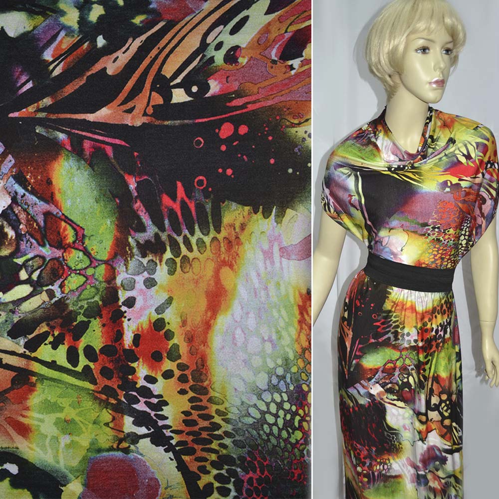 Трикотаж вискозный стрейч оранжево-черно-красный абстрактный рисунок ш.150. Состав ткани: Вискоза-95, Эластан-5. Плотность ткани: 198 г/м.кв. Страна производитель: Германия. Трикотаж - это мягкая плотная материя, не прозрачная. Приятная на ощупь, комфортная в носке. Благодаря содержанию синтетических материй, материал более износостойкий и надолго сохраняет свой первоначальный вид. Ткань отличается своей приятной текстурой, хорошей растяжимостью, практически не мнется. Трикотаж достаточно простой в уходе. Используется для пошива платьев, спортивных костюмов, легких жакетов, поло, футболок и многого другого.