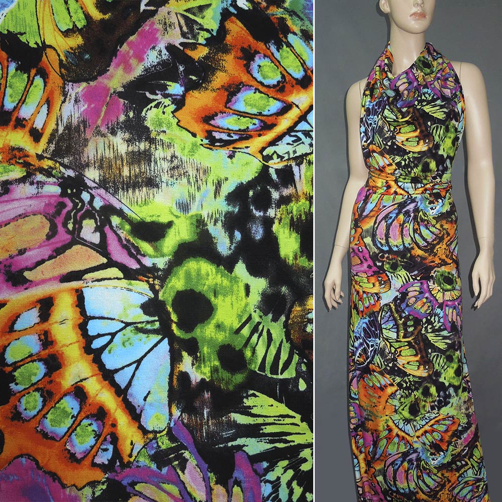 Трикотаж вискозный стрейч оранжево-голубые и салатово-малиновые крылья бабочки (принт) ш.146 купить в розницу и оптом