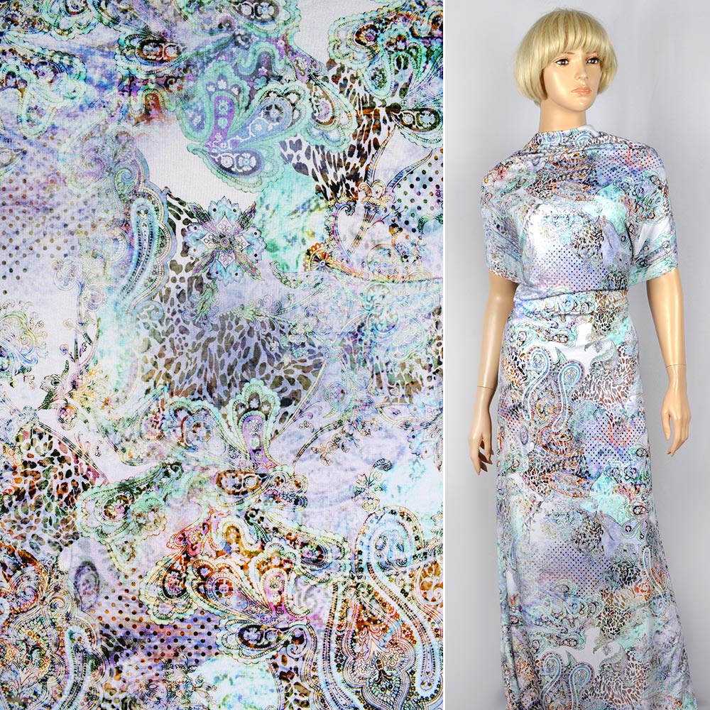 Трикотаж вискозный стрейч "Apanage" белый в зелено-рыже-голубой растительный принт ш.145. Состав ткани: Вискоза-94, Эластан-6. Плотность ткани: 209 г/м.кв. Страна производитель: Франция. Трикотаж - это мягкая плотная материя, не прозрачная. Приятная на ощупь, комфортная в носке. Благодаря содержанию синтетических материй, материал более износостойкий и надолго сохраняет свой первоначальный вид. Ткань отличается своей приятной текстурой, хорошей растяжимостью, практически не мнется. Трикотаж достаточно простой в уходе. Используется для пошива платьев, спортивных костюмов, легких жакетов, поло, футболок и многого другого.