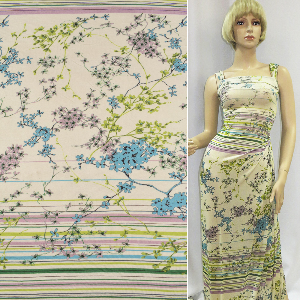 Трикотаж вискозный стрейч песочный с салатово-бирюзовой веточкой цветов раппорт, ш.140. Состав ткани: Вискоза-96, Эластан-4. Плотность ткани: 110 г/м.кв. Страна производитель: Германия. Трикотаж - это мягкая плотная материя, не прозрачная. Приятная на ощупь, комфортная в носке. Благодаря содержанию синтетических материй, материал более износостойкий и надолго сохраняет свой первоначальный вид. Ткань отличается своей приятной текстурой, хорошей растяжимостью, практически не мнется. Трикотаж достаточно простой в уходе. Используется для пошива платьев, спортивных костюмов, легких жакетов, поло, футболок и многого другого.