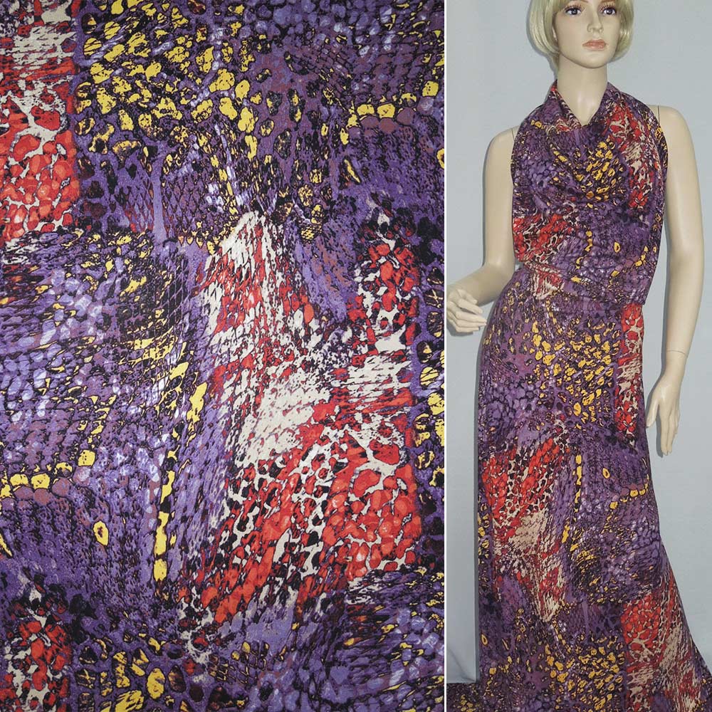 Трикотаж вискозный стрейч рептилия фиолетово-кораллово-желтый ш.145 купить в розницу и оптом