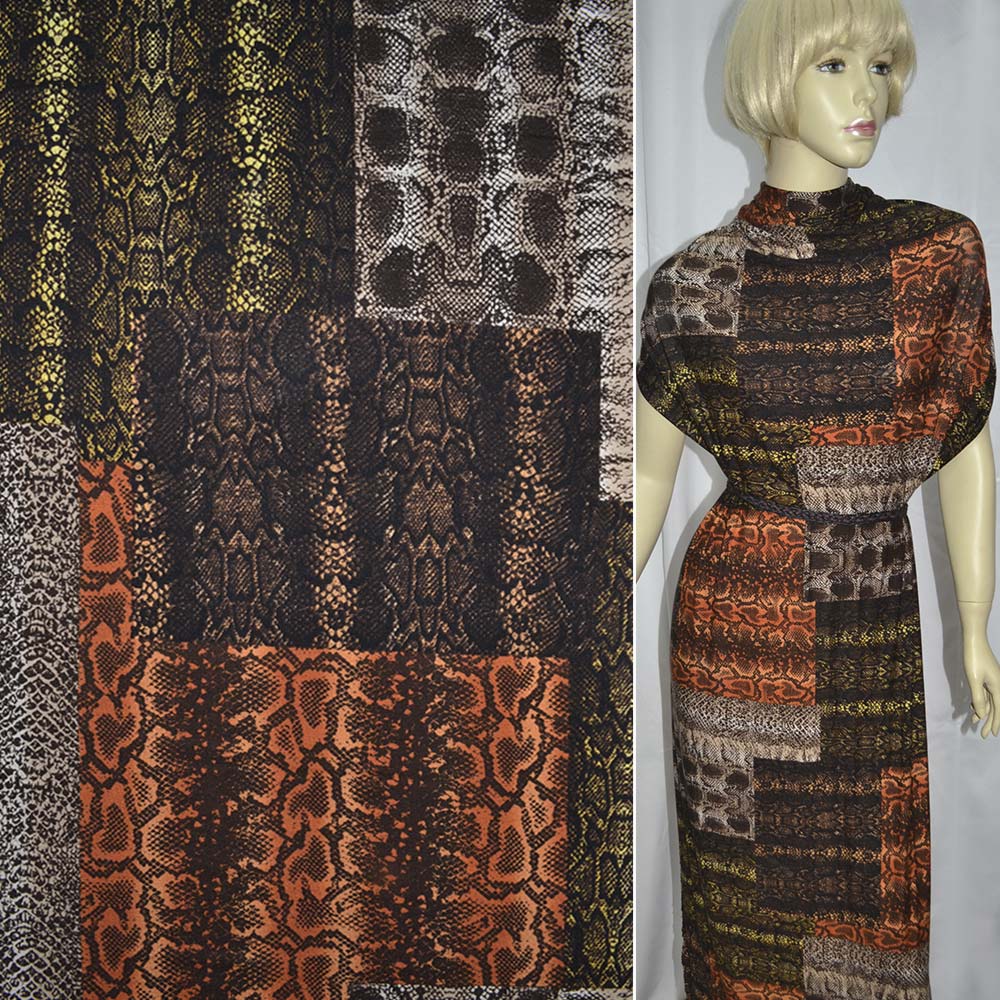 Трикотаж вискозный стрейч рептилия в коричнево-бежево-желтые квадраты ш.145 купить в розницу и оптом