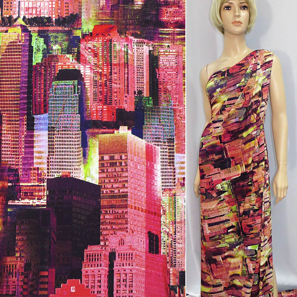 Трикотаж вискозный стрейч розово-салатовый небоскребы ш.150 купить в розницу и оптом