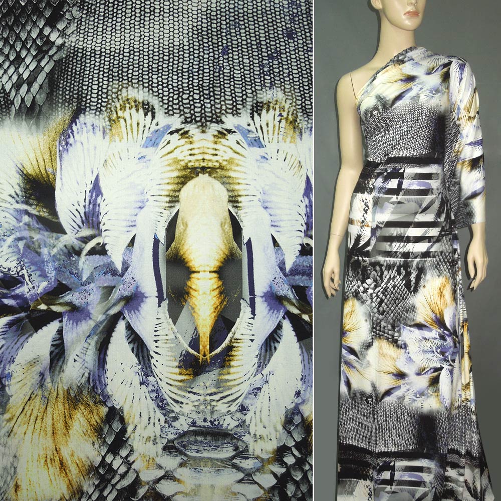 Трикотаж вискозный стрейч серо-белый рептилия + цветы раппорт (принт) ш.145 купить в розницу и оптом