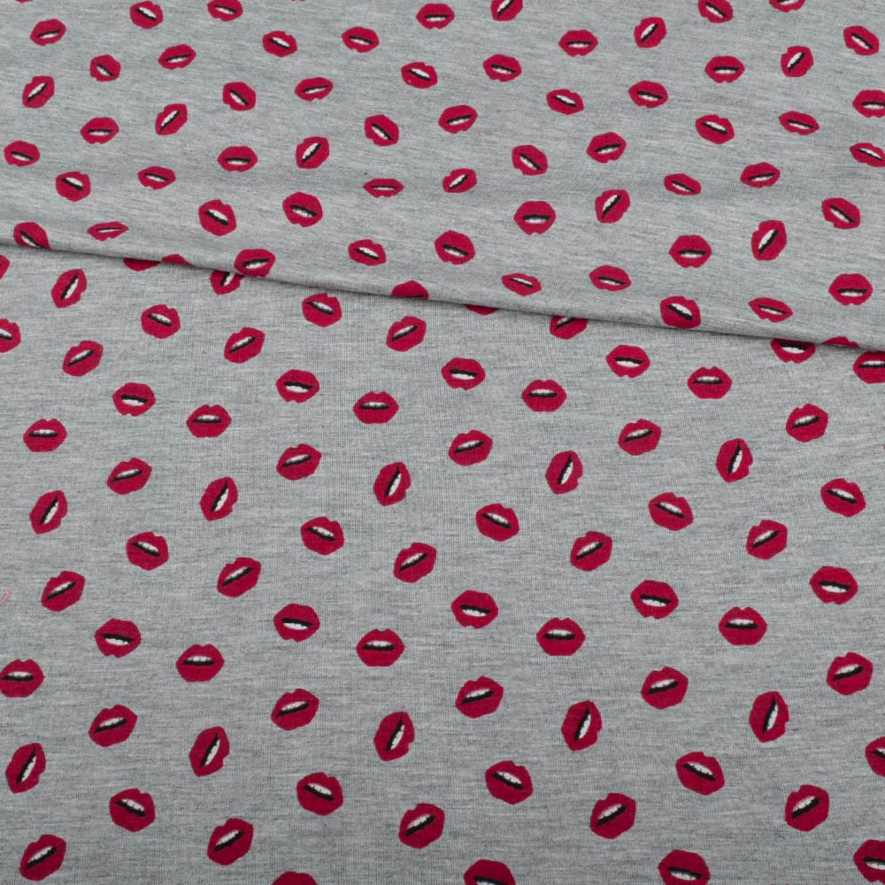 Трикотаж вискозный стрейч серый, красные губы, ш.150 купить в розницу и оптом