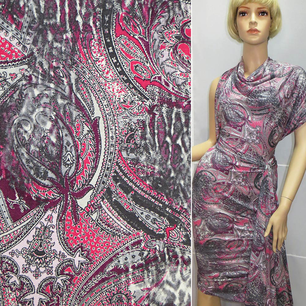 Трикотаж вискозный стрейч серый светлый с розовыми огурцами (принт) ш.150. Состав ткани: Вискоза-96, Эластан-4. Плотность ткани: 213 г/м.кв. Страна производитель: Германия. Трикотаж - это мягкая плотная материя, не прозрачная. Приятная на ощупь, комфортная в носке. Благодаря содержанию синтетических материй, материал более износостойкий и надолго сохраняет свой первоначальный вид. Ткань отличается своей приятной текстурой, хорошей растяжимостью, практически не мнется. Трикотаж достаточно простой в уходе. Используется для пошива платьев, спортивных костюмов, легких жакетов, поло, футболок и многого другого.
