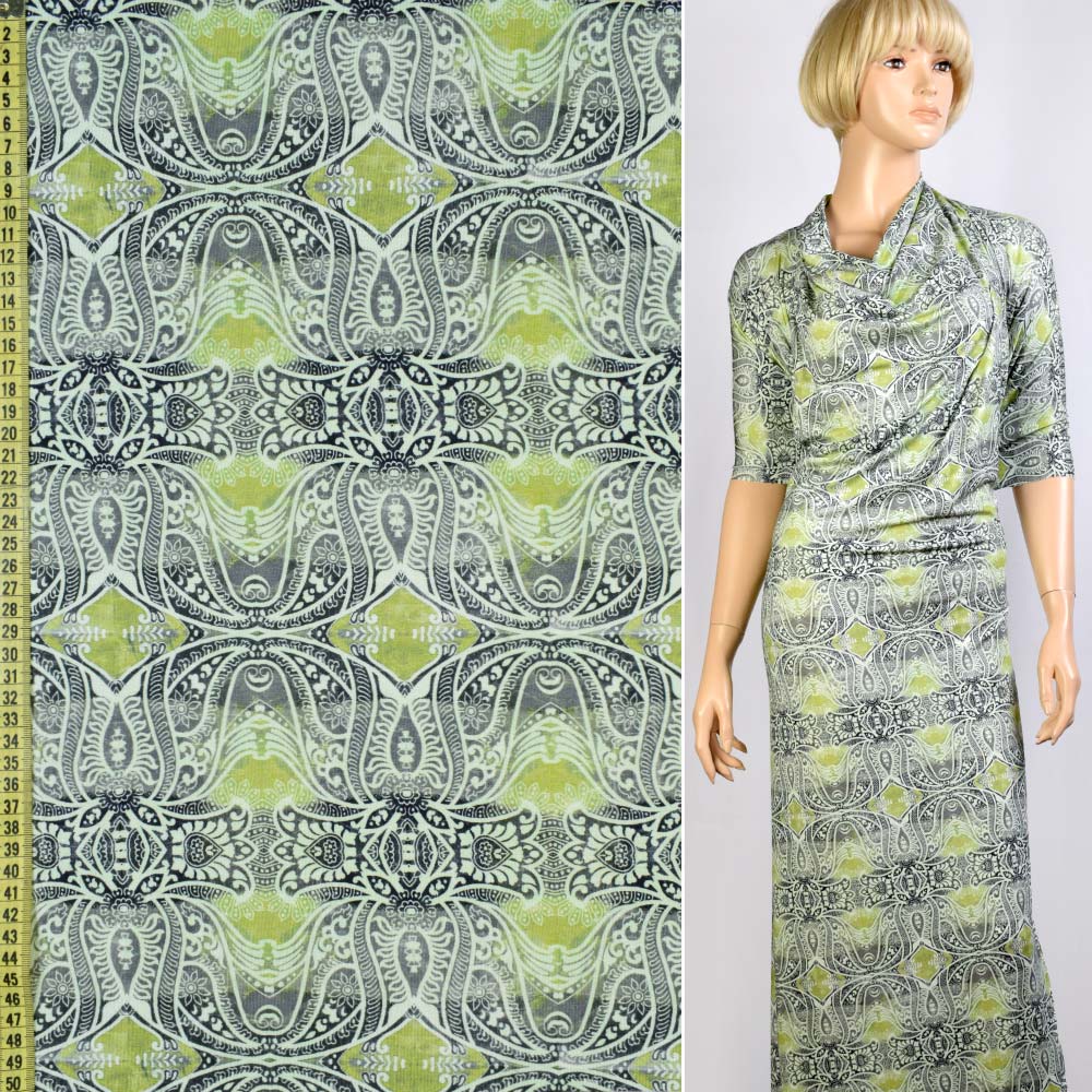 Трикотаж вискозный стрейч серый в молочно-салатовый орнамент, ш.150 купить в розницу и оптом