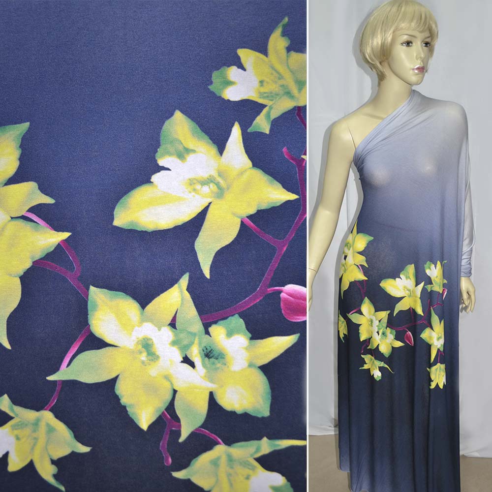 Трикотаж вискозный стрейч сине-голубой с большим цветком (раппорт) ш.135 купить в розницу и оптом