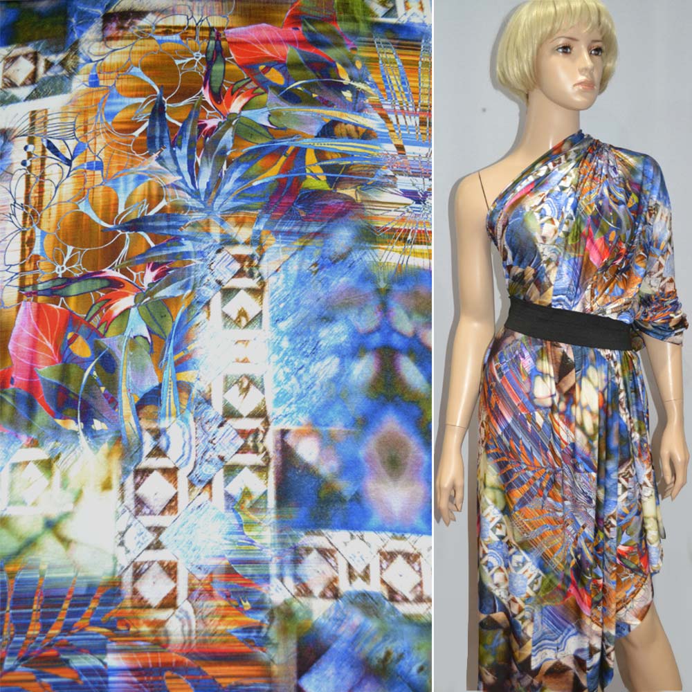 Трикотаж вискозный стрейч сине-оранжево-белый с абстрактным рисунком ш.148. Состав ткани: Вискоза-95, Эластан-5. Плотность ткани: 190 г/м.кв. Страна производитель: Германия. Трикотаж - это мягкая плотная материя, не прозрачная. Приятная на ощупь, комфортная в носке. Благодаря содержанию синтетических материй, материал более износостойкий и надолго сохраняет свой первоначальный вид. Ткань отличается своей приятной текстурой, хорошей растяжимостью, практически не мнется. Трикотаж достаточно простой в уходе. Используется для пошива платьев, спортивных костюмов, легких жакетов, поло, футболок и многого другого.