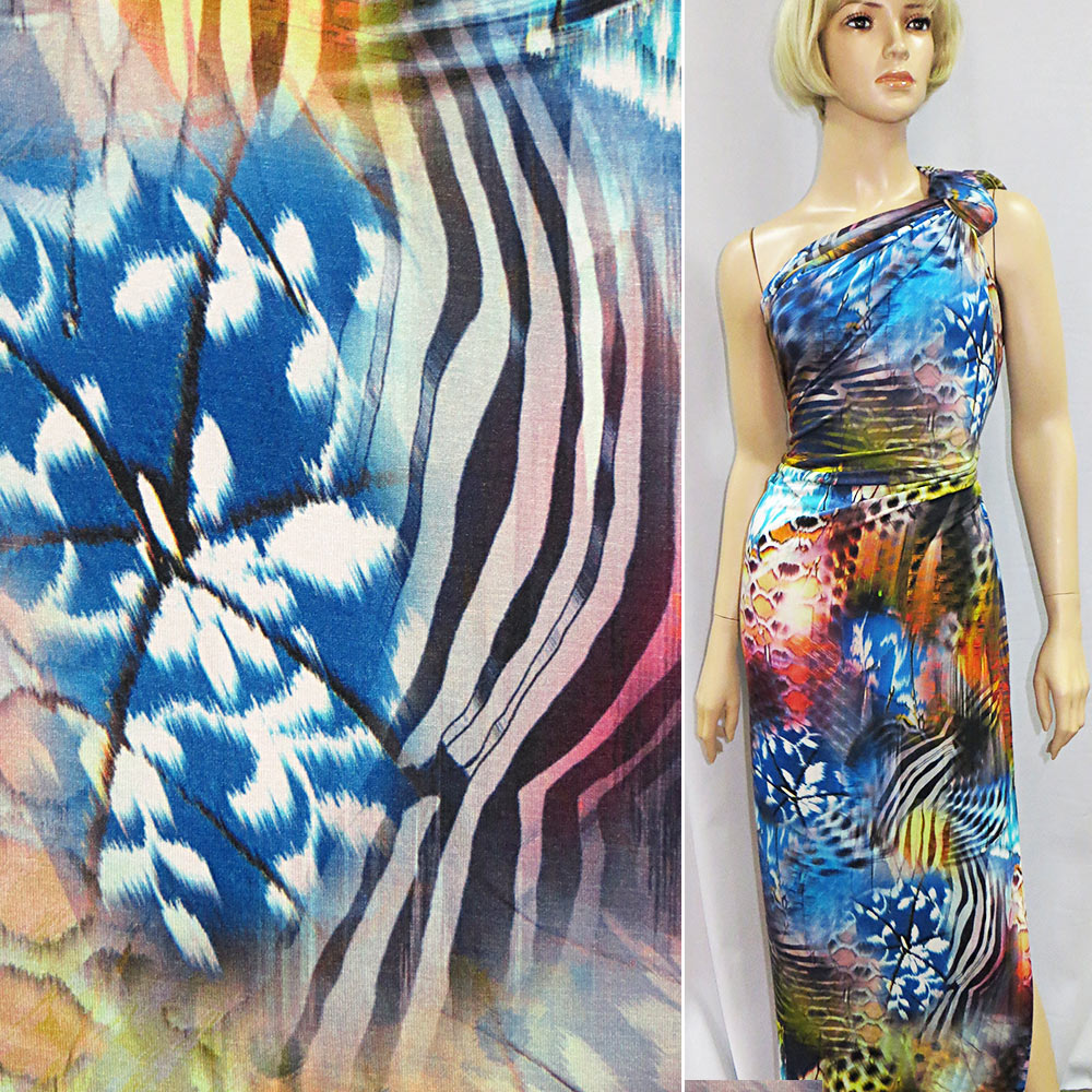 Трикотаж вискозный стрейч сине-желтый с разноцветным абстрактным рисунком ш.150. Состав ткани: Вискоза-94, Эластан-6. Плотность ткани: 120 г/м.кв. Страна производитель: Германия. Трикотаж - это мягкая плотная материя, не прозрачная. Приятная на ощупь, комфортная в носке. Благодаря содержанию синтетических материй, материал более износостойкий и надолго сохраняет свой первоначальный вид. Ткань отличается своей приятной текстурой, хорошей растяжимостью, практически не мнется. Трикотаж достаточно простой в уходе. Используется для пошива платьев, спортивных костюмов, легких жакетов, поло, футболок и многого другого.
