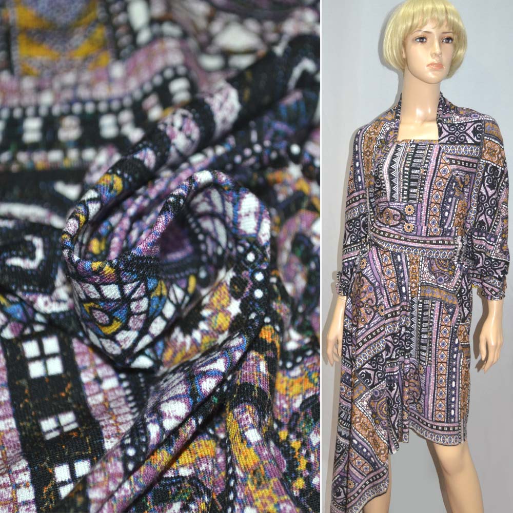 Трикотаж вискозный стрейч сиренево-черные квадраты с орнаментом ш.150 купить в розницу и оптом
