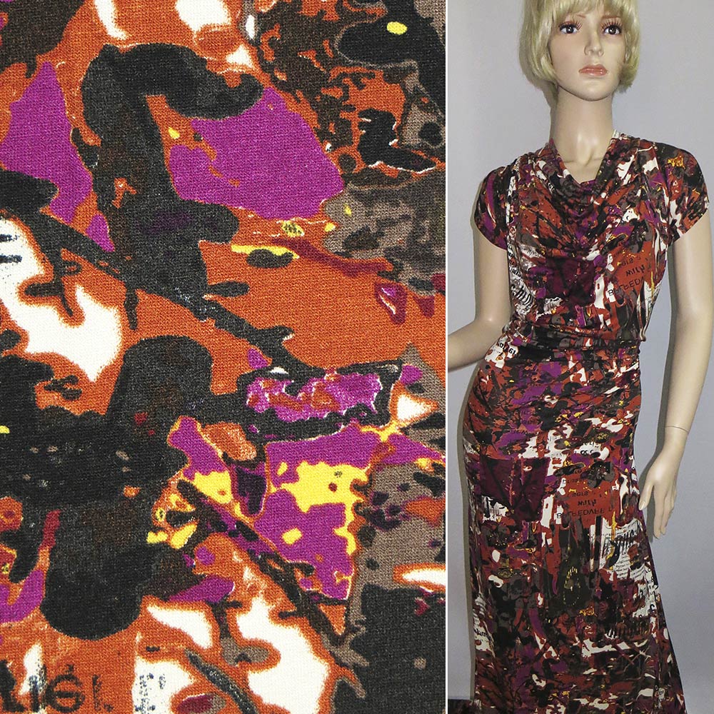 Трикотаж вискозный стрейч терракотово-фиолетово-белый с фрагментами газеты ш.150. Состав ткани: Вискоза-95, Эластан-5. Плотность ткани: 182 г/м.кв. Страна производитель: Германия. Трикотаж - это мягкая плотная материя, не прозрачная. Приятная на ощупь, комфортная в носке. Благодаря содержанию синтетических материй, материал более износостойкий и надолго сохраняет свой первоначальный вид. Ткань отличается своей приятной текстурой, хорошей растяжимостью, практически не мнется. Трикотаж достаточно простой в уходе. Используется для пошива платьев, спортивных костюмов, легких жакетов, поло, футболок и многого другого.