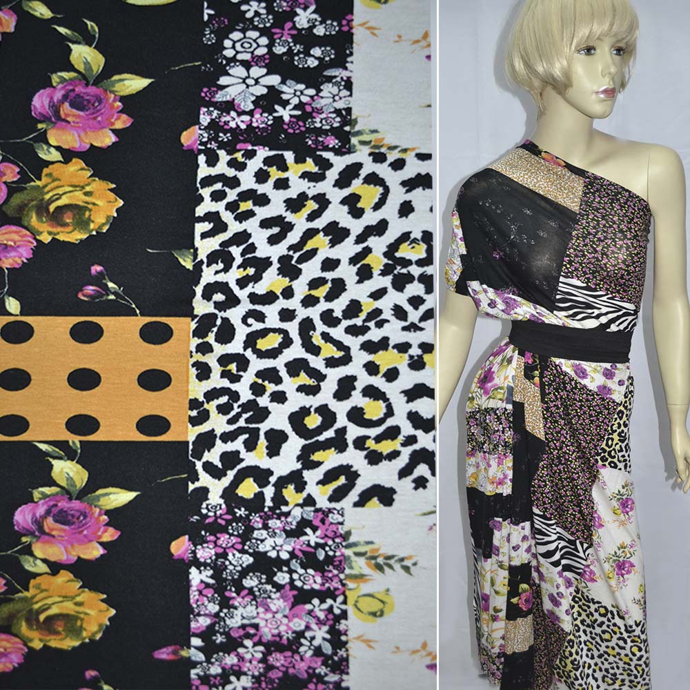 Трикотаж вискозный стрейч в черно-бело-бежевые квадраты с цветами и кругами ш.160. Состав ткани: Вискоза-96, Эластан-4. Плотность ткани: 229 г/м.кв. Страна производитель: Германия. Трикотаж - это мягкая плотная материя, не прозрачная. Приятная на ощупь, комфортная в носке. Благодаря содержанию синтетических материй, материал более износостойкий и надолго сохраняет свой первоначальный вид. Ткань отличается своей приятной текстурой, хорошей растяжимостью, практически не мнется. Трикотаж достаточно простой в уходе. Используется для пошива платьев, спортивных костюмов, легких жакетов, поло, футболок и многого другого.