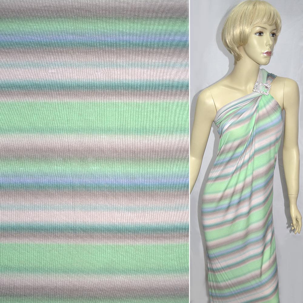 Трикотаж вискозный стрейч в салатово-голубые и белые полоски ш.140 купить в розницу и оптом