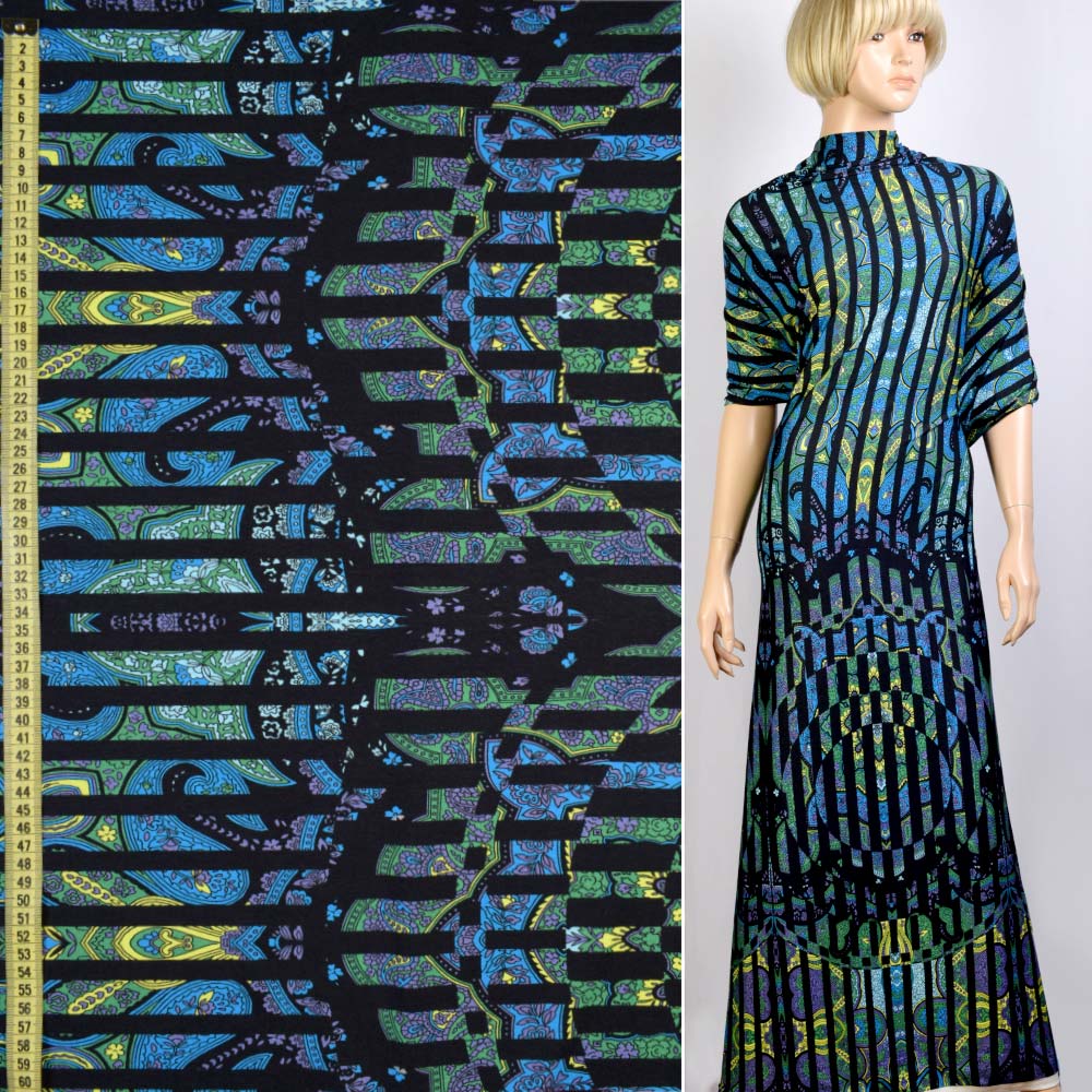 Трикотаж вискозный стрейч в сине-зеленый узор, черные полоски, ш.155 купить в розницу и оптом