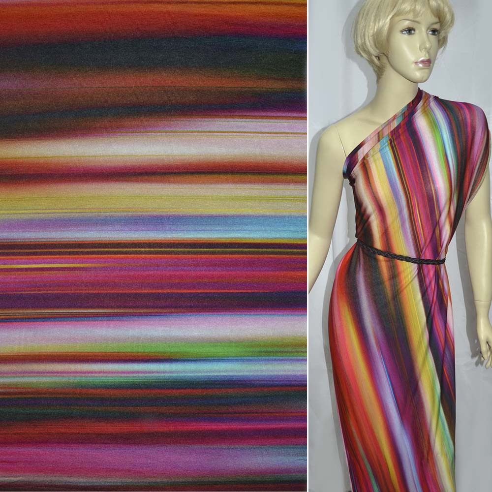 Трикотаж вискозный стрейч в яркие салатовые, красные, оранжевые полоски ш.133 купить в розницу и оптом