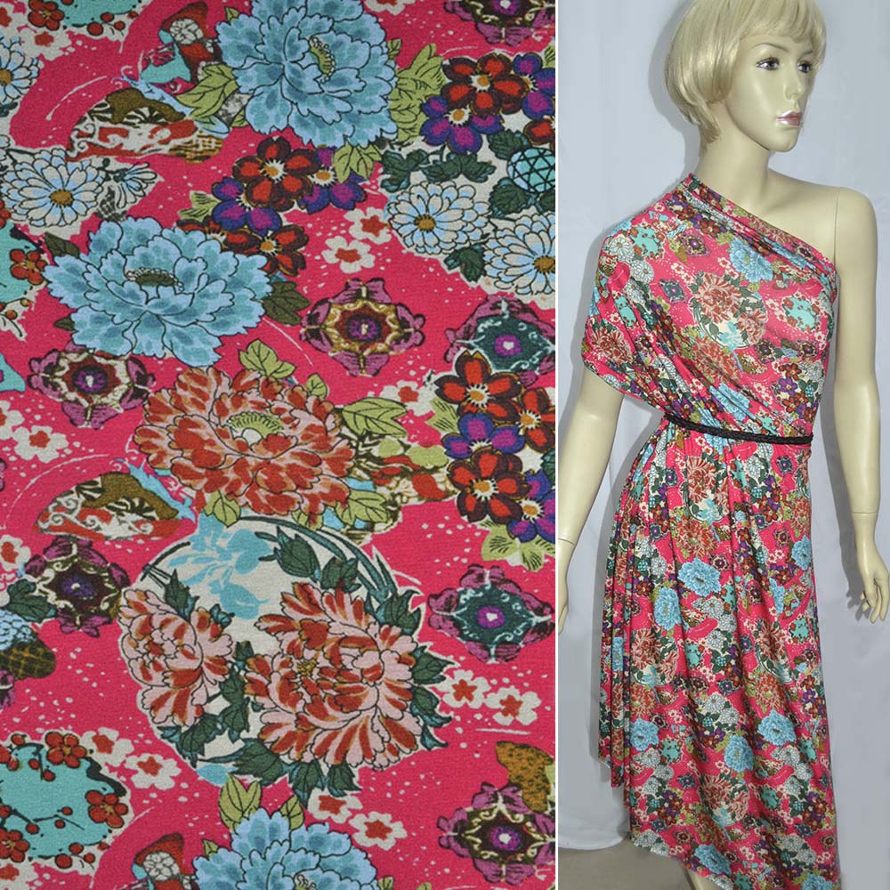 Трикотаж вискозный стрейч ярко-малиновый с разноцветными цветами ш.150. Состав ткани: Вискоза-96, Эластан-4. Плотность ткани: 160 г/м.кв. Страна производитель: Германия. Трикотаж - это мягкая плотная материя, не прозрачная. Приятная на ощупь, комфортная в носке. Благодаря содержанию синтетических материй, материал более износостойкий и надолго сохраняет свой первоначальный вид. Ткань отличается своей приятной текстурой, хорошей растяжимостью, практически не мнется. Трикотаж достаточно простой в уходе. Используется для пошива платьев, спортивных костюмов, легких жакетов, поло, футболок и многого другого.
