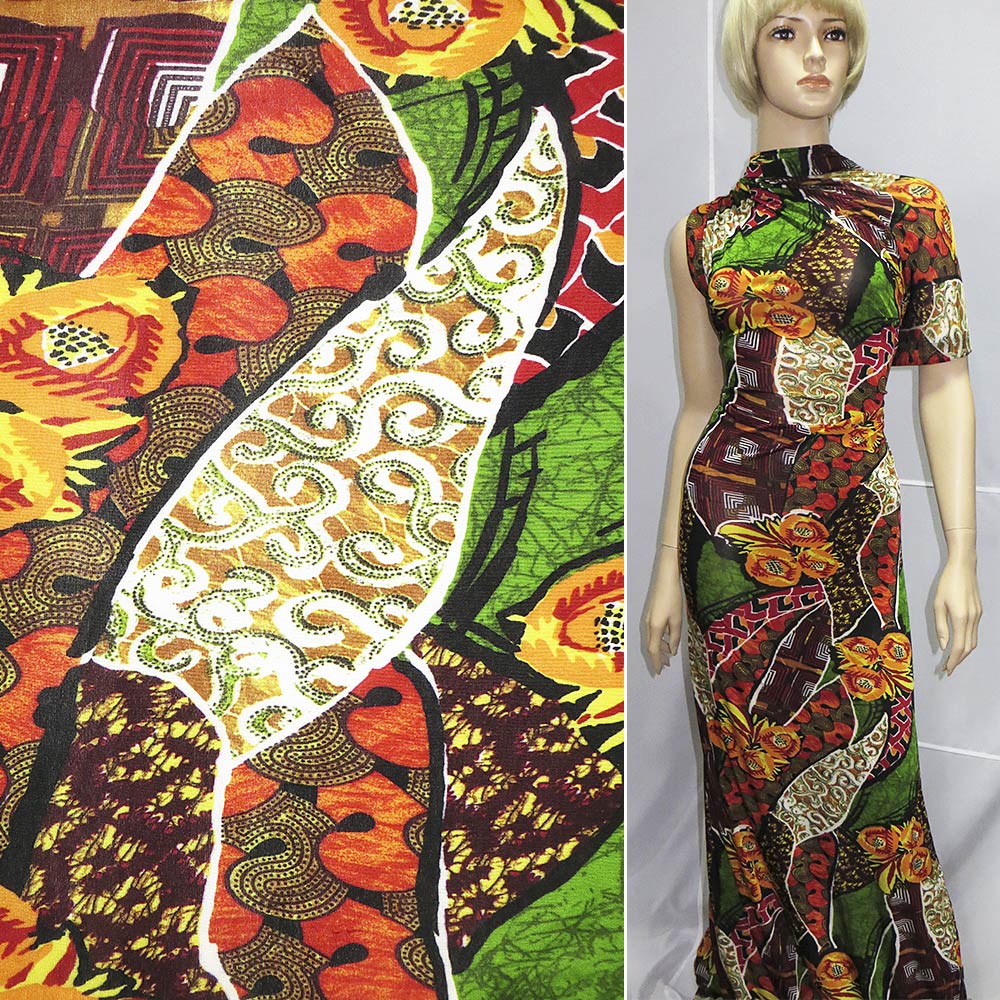 Трикотаж вискозный стрейч зелено-бордовый с желто-оранжевым абстрактным рисунком ш.120 купить в розницу и оптом