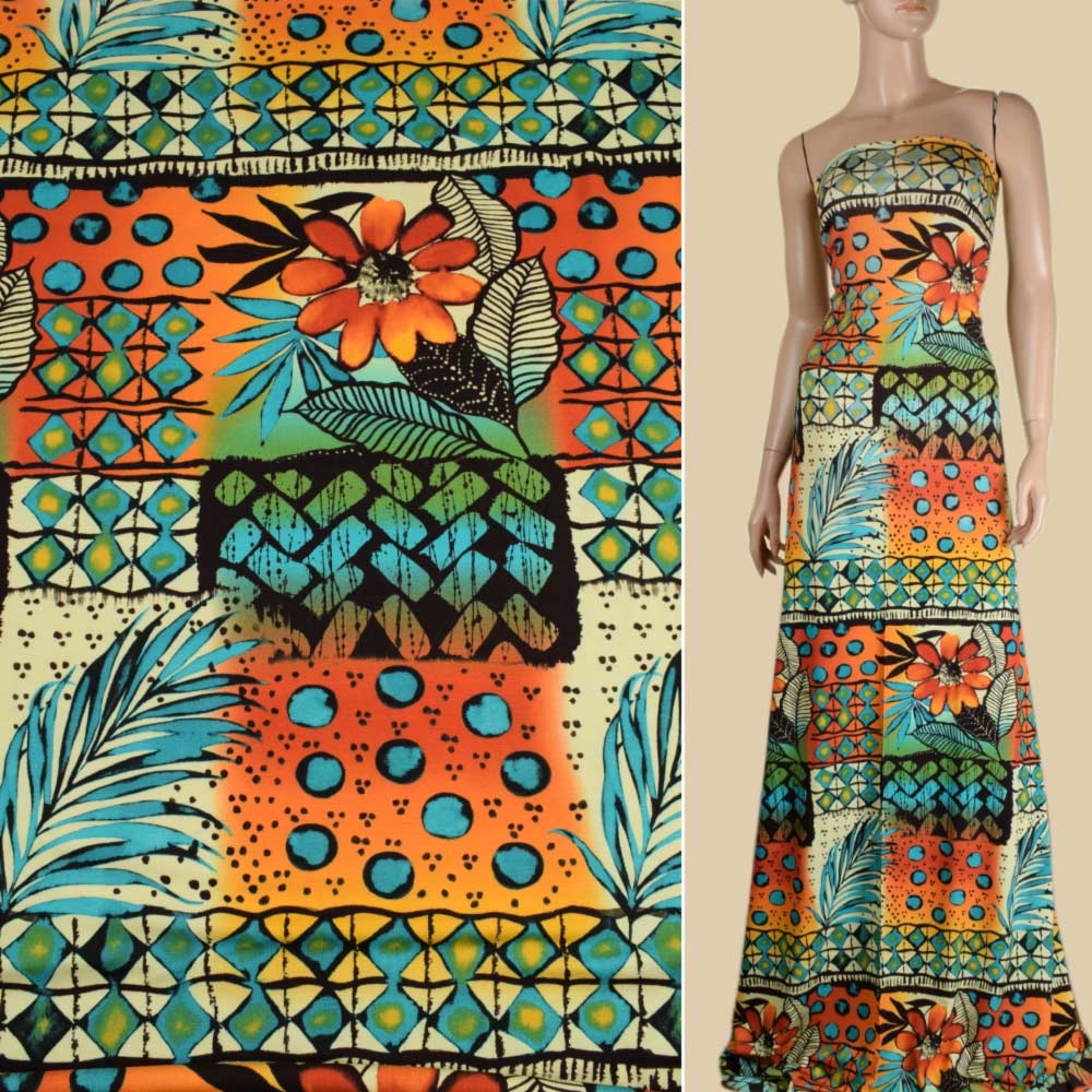 Трикотаж вискозный стрейч зелено-оранжевый с листьями и цветами ш.147 купить в розницу и оптом