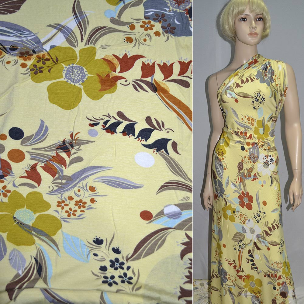 Трикотаж вискозный стрейч желтый светлый с бордовыми, серыми, белыми цветами ш.142 купить в розницу и оптом