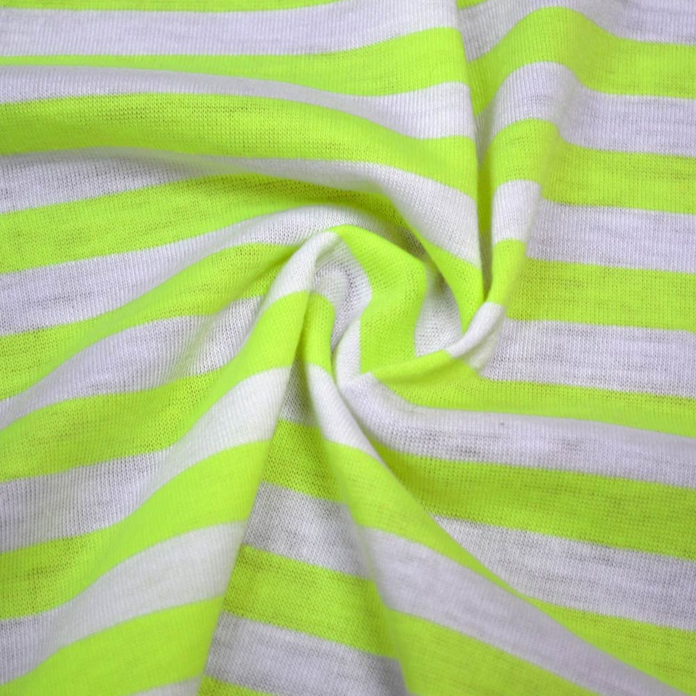Трикотаж с вискозой в полоски 10мм белые и лимонные неоновые ш.175. Состав ткани: Вискоза-30, Полиэстер-70. Плотность ткани: 164 г/м.кв. Страна производитель: Южная Корея. Трикотаж - это мягкая плотная материя, не прозрачная. Приятная на ощупь, комфортная в носке. Благодаря содержанию синтетических материй, материал более износостойкий и надолго сохраняет свой первоначальный вид. Ткань отличается своей приятной текстурой, хорошей растяжимостью, практически не мнется. Трикотаж достаточно простой в уходе. Используется для пошива платьев, спортивных костюмов, легких жакетов, поло, футболок и многого другого.