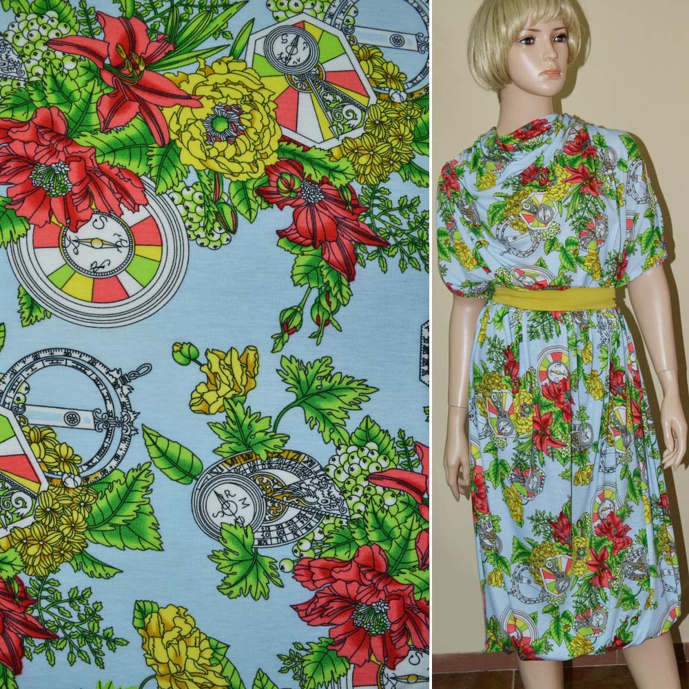 Трикотаж с вискозой бледно-голубой с цветами и компасом ш.170 купить в розницу и оптом