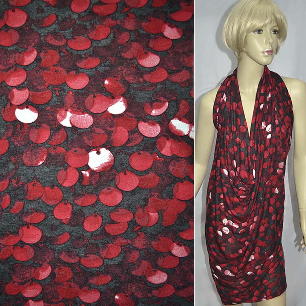 Трикотаж вискоза с шерстью черный принт пайетки черно-красный ш.140. Состав ткани: Вискоза-85, Шерсть-15. Плотность ткани: 125 г/м.кв. Страна производитель: Германия. Трикотаж - это мягкая плотная материя, не прозрачная. Приятная на ощупь, комфортная в носке. Благодаря содержанию синтетических материй, материал более износостойкий и надолго сохраняет свой первоначальный вид. Ткань отличается своей приятной текстурой, хорошей растяжимостью, практически не мнется. Трикотаж достаточно простой в уходе. Используется для пошива платьев, спортивных костюмов, легких жакетов, поло, футболок и многого другого.