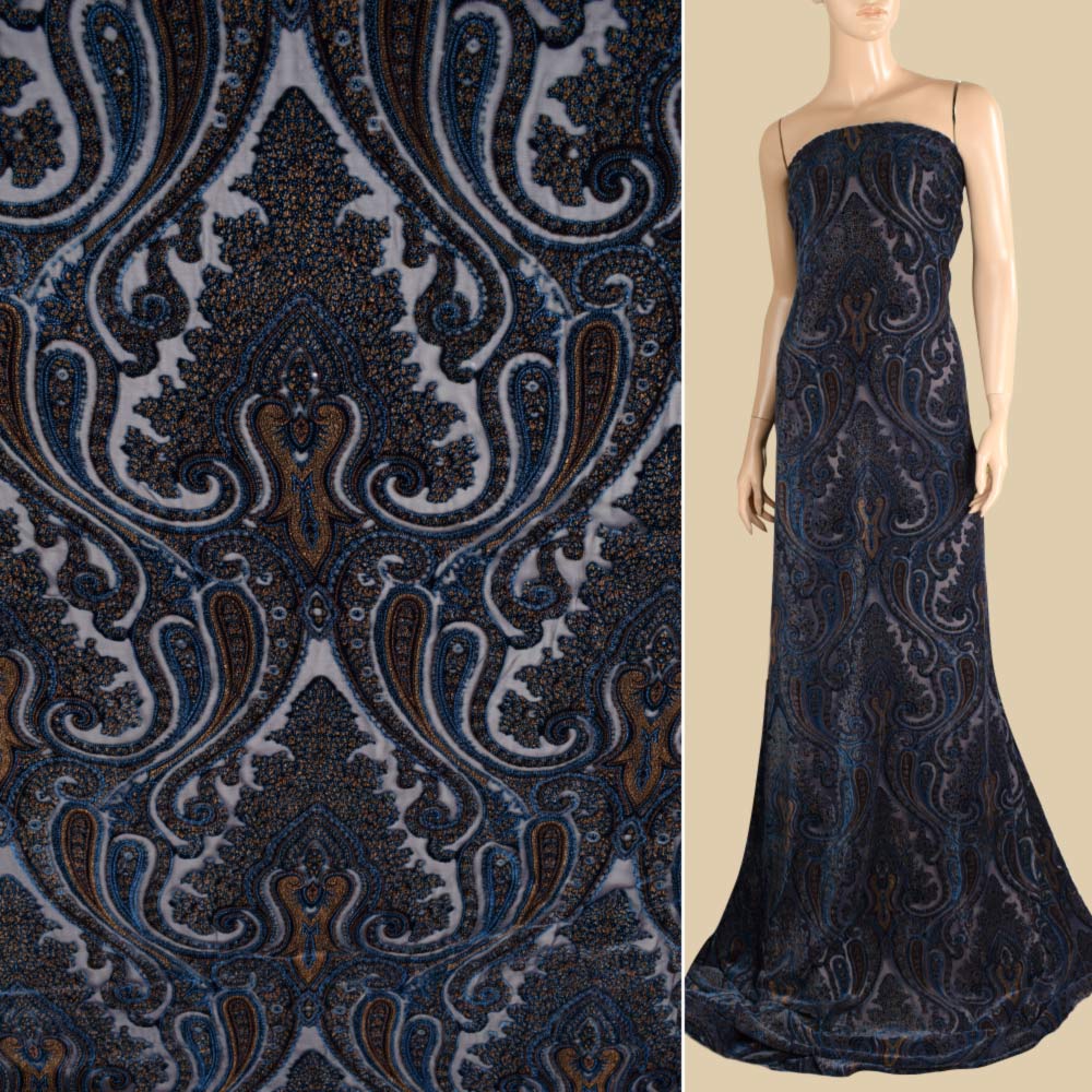 Бархат шелковый на шифоне, дамасский узор синий с золотым штампом ш.132 купить в розницу и оптом