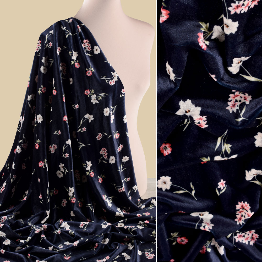 Велюр* стрейч синий темный в розовые цветы ш.150. Состав ткани: Полиэстер-95, Эластан-5. Плотность ткани: 292 г/м.кв. Страна производитель: Южная Корея. Это прочная ткань, устойчивая к механическим воздействиям, имеет хорошую теплоизоляцию. Велюр ноский, не подвергается каким-либо деформациям и изменениям в процессе носки и стирок. Отлично пропускает воздух, не теряет красивый внешний вид и форму. Одежду из велюра не требуется гладить, поскольку ткань не мнется. Широко используется для пошива одежды как для взрослых, так и на детей, для пошива бальных платьев, что придает им богатый вид.