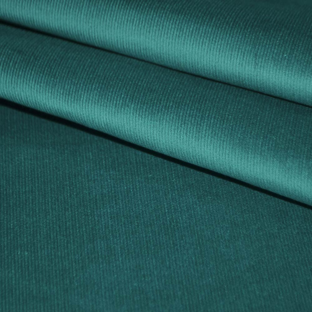Микровельвет стрейч темно-бирюзовый ш.150. Состав ткани: Хлопок-97, Эластан-3. Плотность ткани: 282 г/м.кв. Страна производитель: Южная Корея. Вельветовая ткань особенна, ее невозможно спутать с другим материалом. За счет продольных полос, покрытых ворсом, и необычного сияния, возникающего из-за игры света между рядами ворсинок, она выглядит благородно и креативно. С изнаночной стороны поверхность напоминает холст. Благодаря практичности и доступной стоимости вельвет получил широкое распространение в текстильном производстве. Из него шьют самую различную одежду: платья, куртки, брюки, комбинезоны, пальто, головные уборы, обувь.
