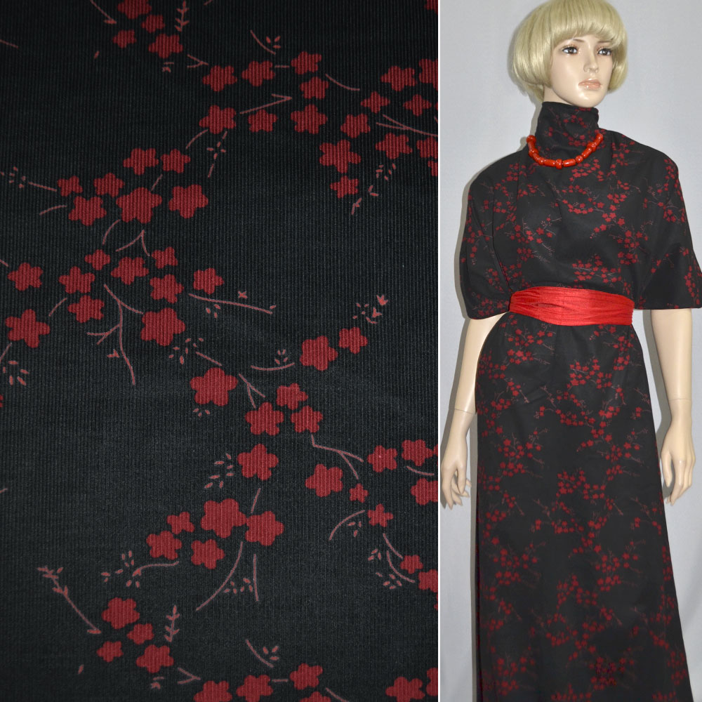 Микровельвет черный с красными цветами, ш.110. Состав ткани: Хлопок-100. Плотность ткани: 142 г/м.кв. Страна производитель: Южная Корея. Вельвет отличается от других материалов характерными продольными полосами-рубчиками из ворса на лицевой стороне. Изнанка у материала ровная и похожая на холст. Он бархатистый, с мягкой фактурой и приятный на ощупь. Игра света, отражаясь между рядами, придает полотну легкий блеск и благородный вид.