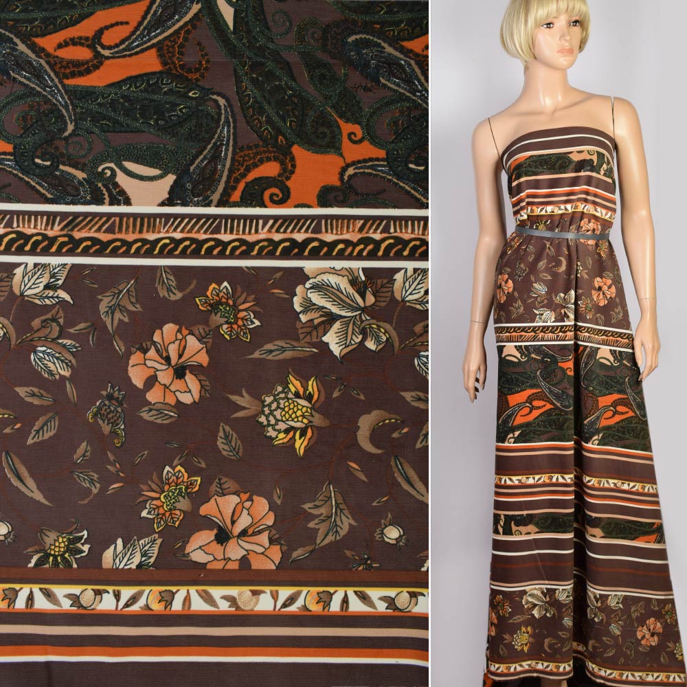 Микровельвет коричневый с желто-оранжевым орнаментом купон, ш.140 купить в розницу и оптом